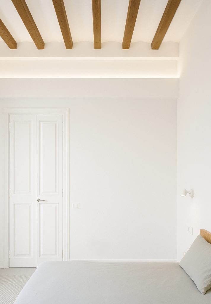 El proyecto pone de manifiesto la recuperación del techo de vigas de madera a 4 m de altura con la retirada del falso techo existente y la proyección de iluminación indirecta.
